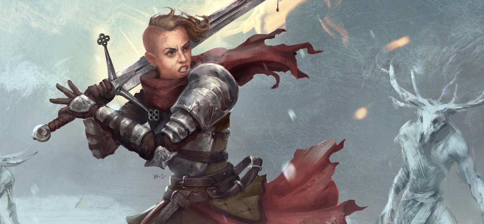 I would like her main weapon to be a claymore sword. The sword is enchanted with a Holy Fire.