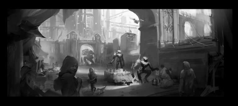 Street01Dystopian street view concept art. Robots patrolling and helping some poor humans living in the slums. They distribute supplies to the needy and the sick.
